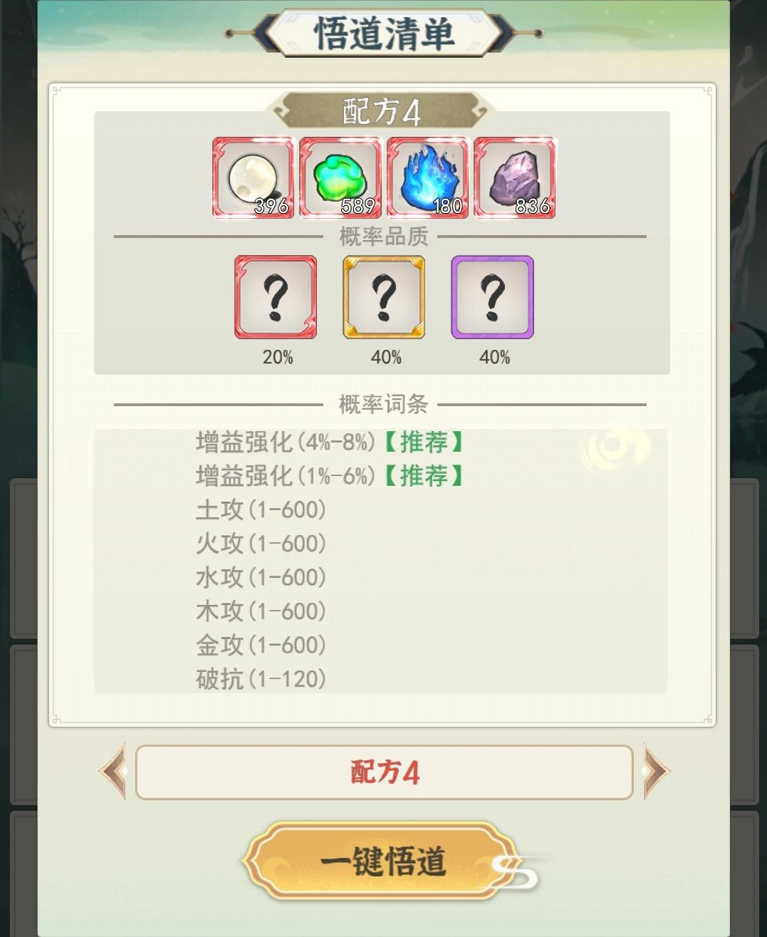 打开悟道,我们使用养蛊法来刷神通,使用配方4