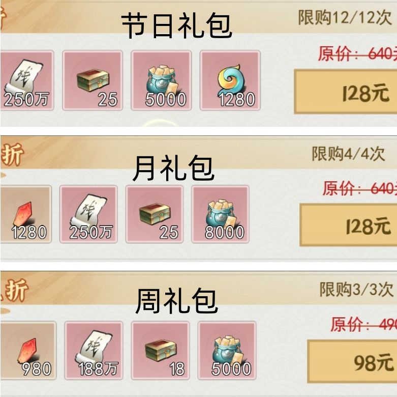 仙玉+碎片+灵石,三者构成了千氪往上的超高性价比礼包,对于千氪可以加快仙灵娃娃获取速度,对万氪也可以加快仙灵娃娃获取速度,月和周的万能碎片性价比比较高,每日礼包的不是很推荐