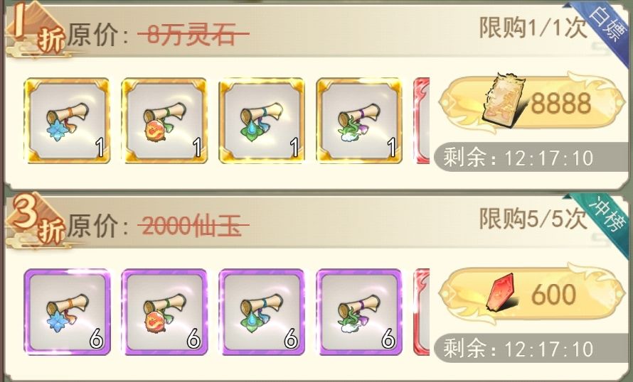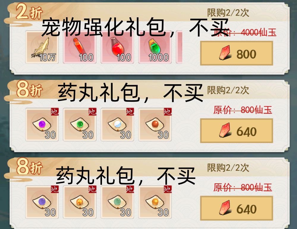书灵礼包:仙玉版的月礼包和周礼包里都有,书灵可以说是飞升前的主要战斗力来源,人界的时候要用仙玉买,飞升后灵界可以用灵石无限购,买几个打的过关卡就可以了,灵界可以用灵石买再补上