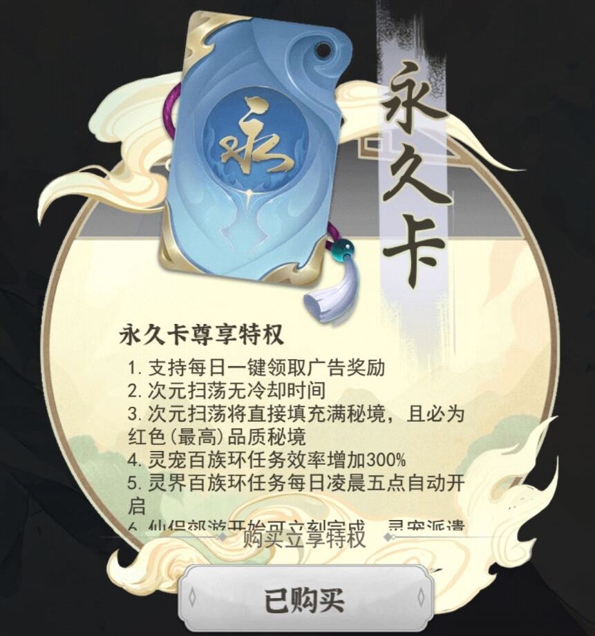 0氪玩家也需要购买,在冲虚阶段使用的,大概是买10天,飞升计算经验的时候再看看用不用补,多买是不亏的,30天每天买满都没问题,不亏,就是比较花仙玉