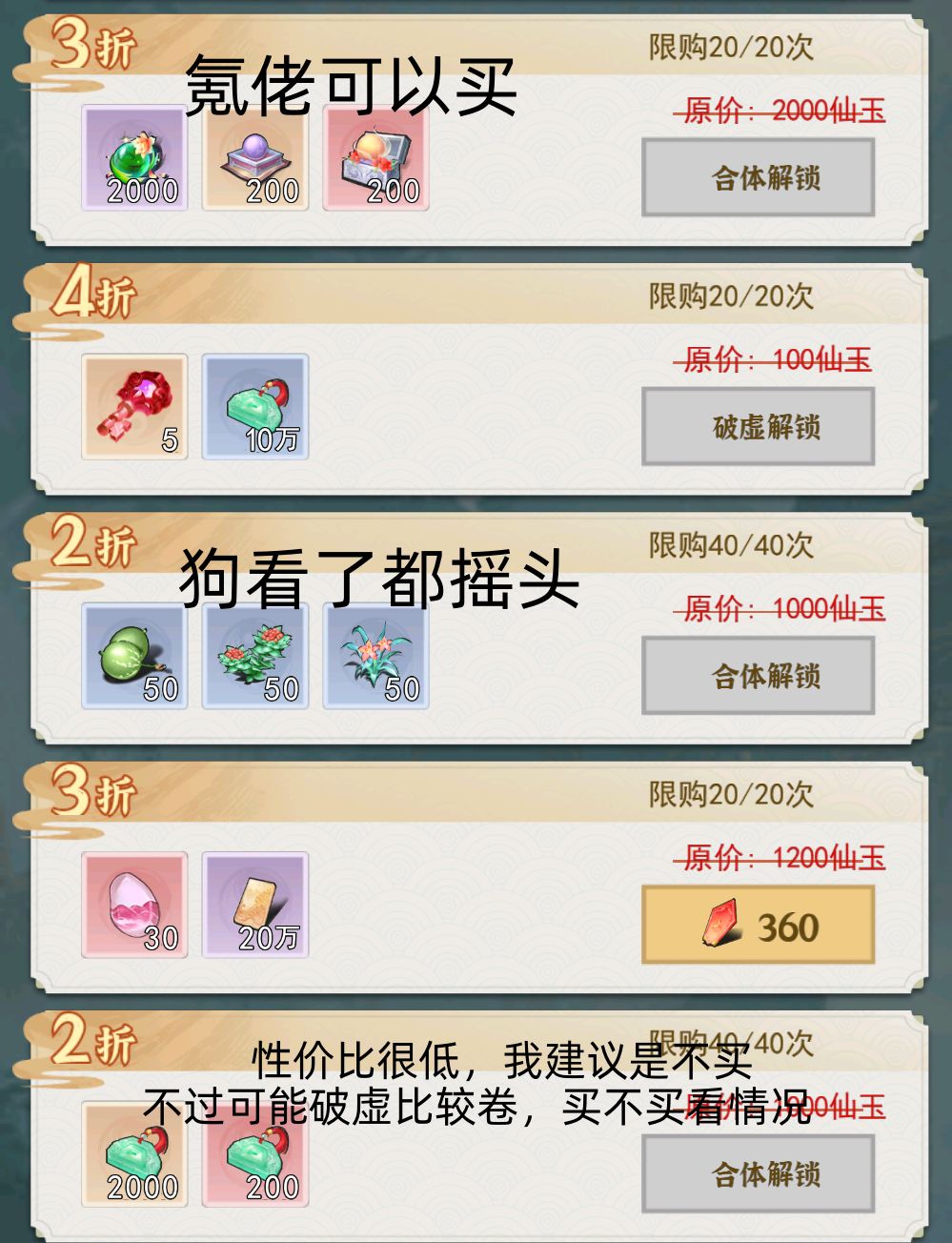 至于3卡5卡这些想买钥匙又想法宝,这样子仙玉明显比较紧张,毕竟充了钱明显是想努力一下冲榜的,所以可以等一个月后再买,如果想买钥匙又想买法宝礼包,结缘必须搞!如果有时间可以自己肝那最好,0成本。也可以买,也可以代