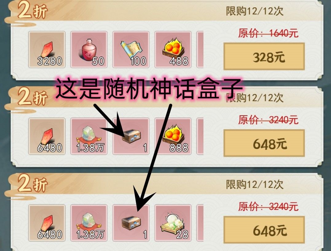 氪金玩家们请注意,648大地雷礼包,哪怕是万氪我都不建议买,详细内容较多,礼包篇结尾会详细介绍这个648礼包,就算要买也是买带有精魄的礼包,仙果没什么性价比,8月更新后礼包再次加强了,2.88w太白还是挺多的,你问我推不推荐?不推荐