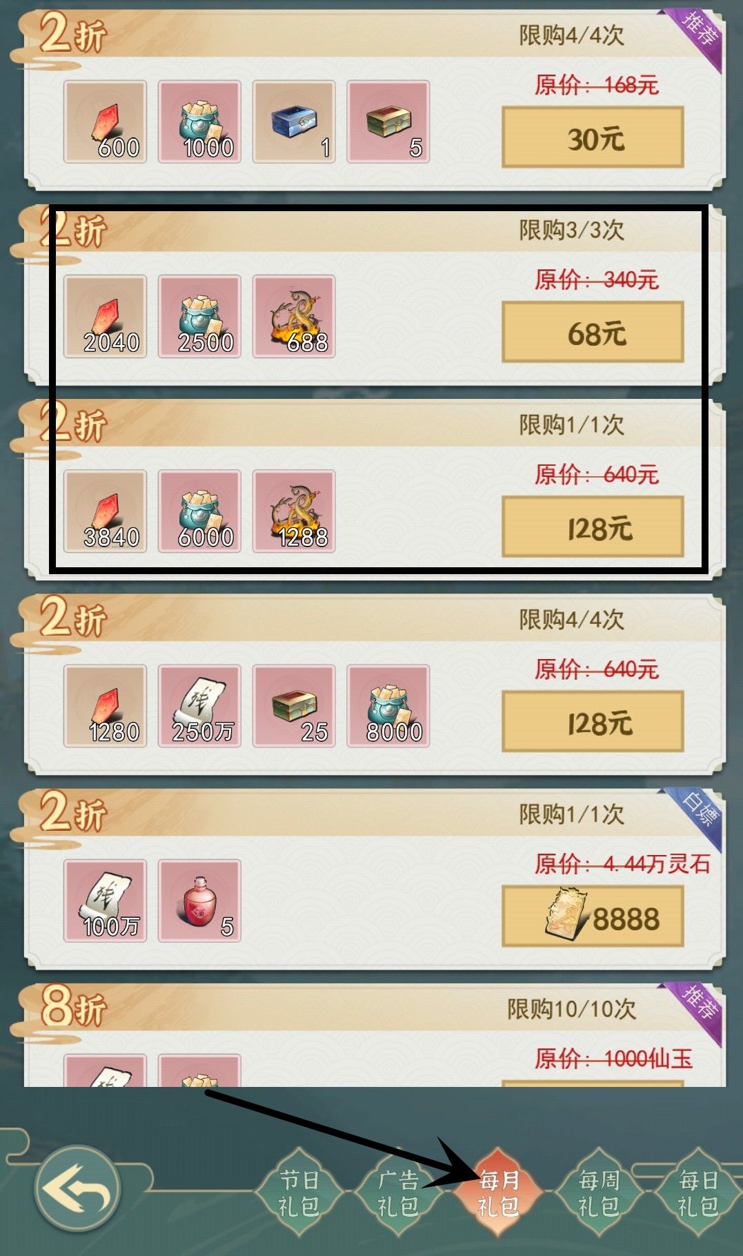 每月礼包:2折的法相礼包(2折的宠物礼包看情况)