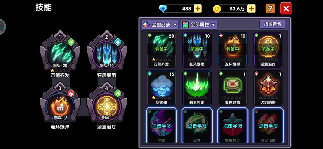 只需要对辉煌升级升星,在这4个技能中,只有辉煌会影响你的伤害,带连矢是为了回蓝(宠物也带企鹅,帮助回蓝,或者南瓜增伤)