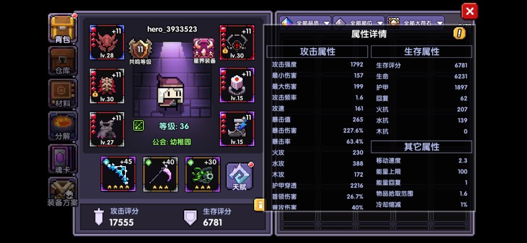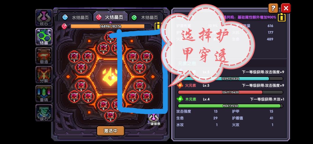 在属性筛选里面勾选元素穿透,选择图中这样橙色的元素穿透进行升星,至于升级,可以先不着急,因为第二天获取到的宝石数量有限,我们可以等第三天再操作。