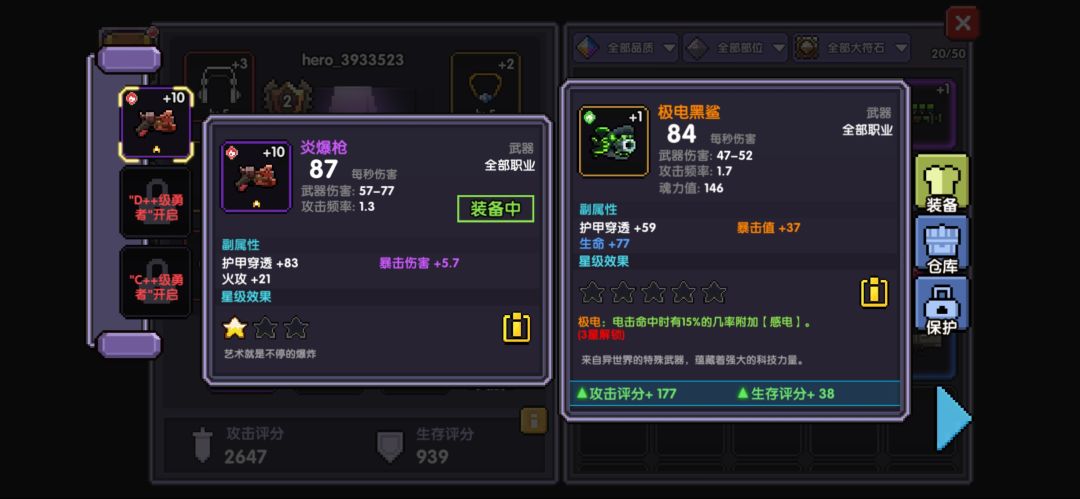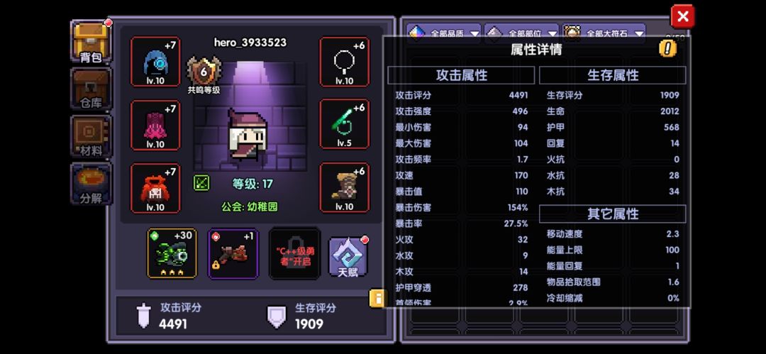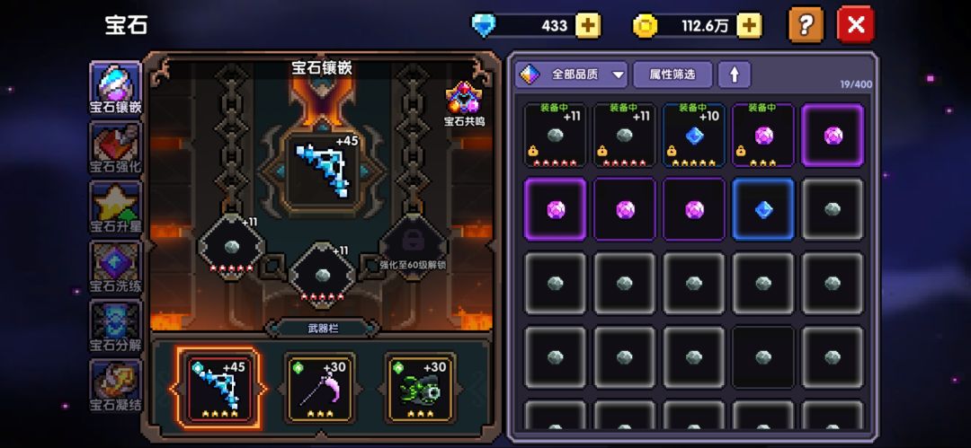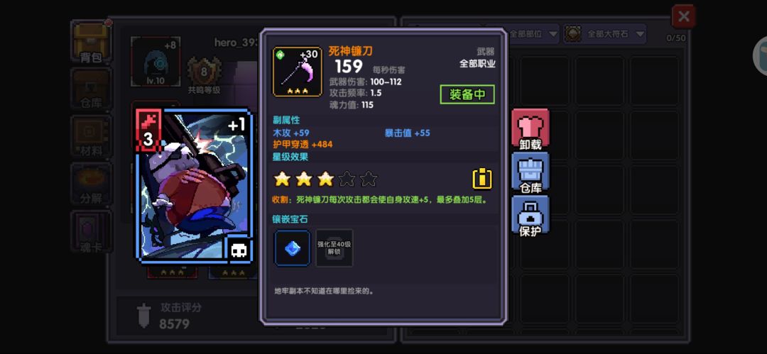 在推关的过程中,记得把其他纯色四孔的装备放到仓库(为智慧核心做准备工作),全蓝四孔的装备和身上的装备比较调换