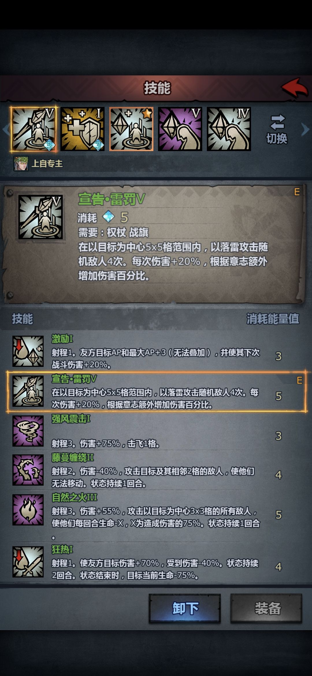 技能:雷罚,4级有4次伤害,所以推荐4级以上,技能来源于天启骑士,通过传授可得。