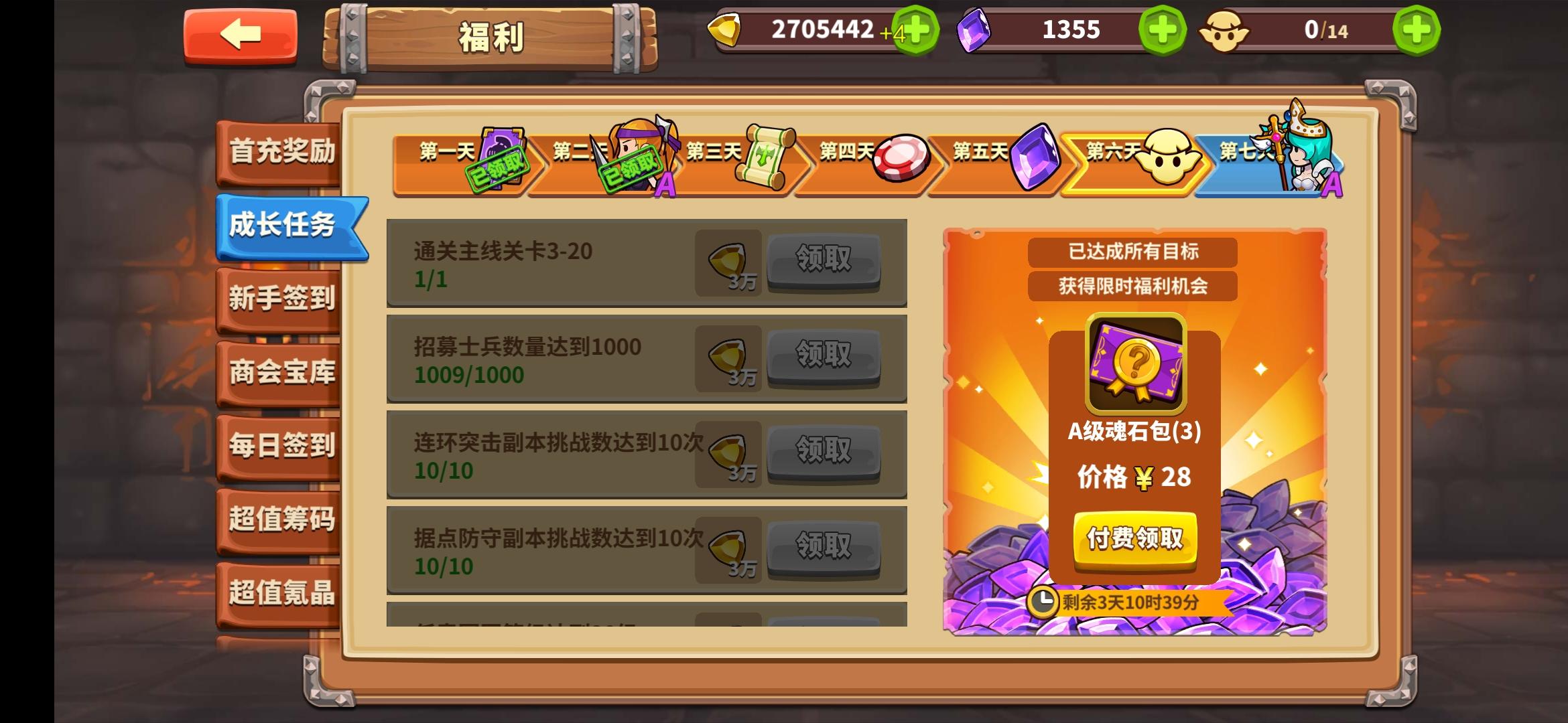 接下来就是通过5-20开启宝物副本了,(这个游戏只有过了这关以后才算开始,前期是很难,但是别放弃,宝物有了之后就会起飞,而且就算要放弃,也要等第一个宝物10抽鉴定人品后再退游也不迟)这里就是第二个微氪点了,买18RMB2次紫色鉴定的礼包,鉴定出2个哥布林套装宝物即可,同一部件也可以。然后一个给哥炮,另外一个哥骑。微氪到此结束,运气好,68搞定。剩下的考时间慢慢来吧。