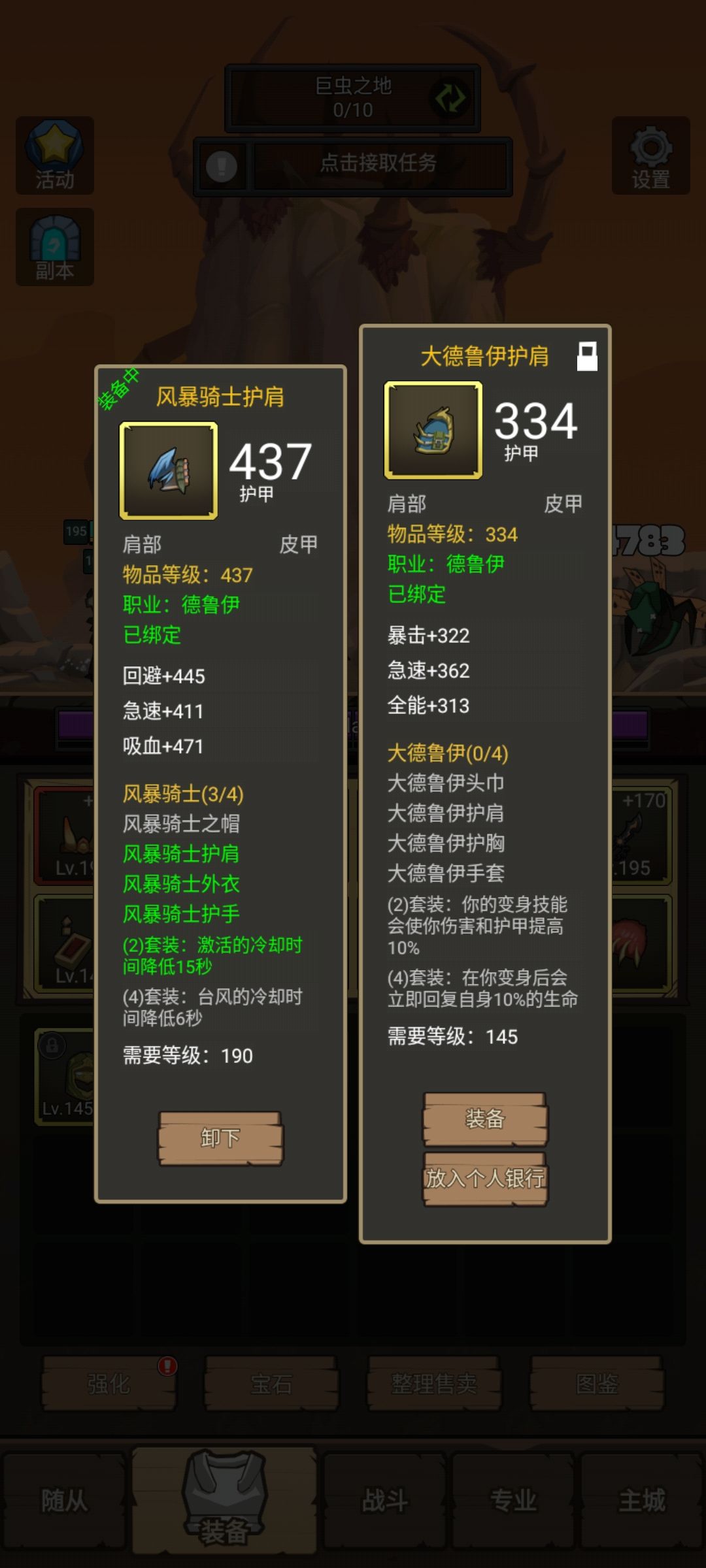 我们可以发现,145两件套加的攻击和护甲并没有消失,这样换装操作后的属性,比190三件+红头,或者2+2的任何一种穿法属性都高,这就是换装流玩法,操作简单,要求条件低,回报就是多一些属性,让各位真爱野德的朋友,能通关更多副本。