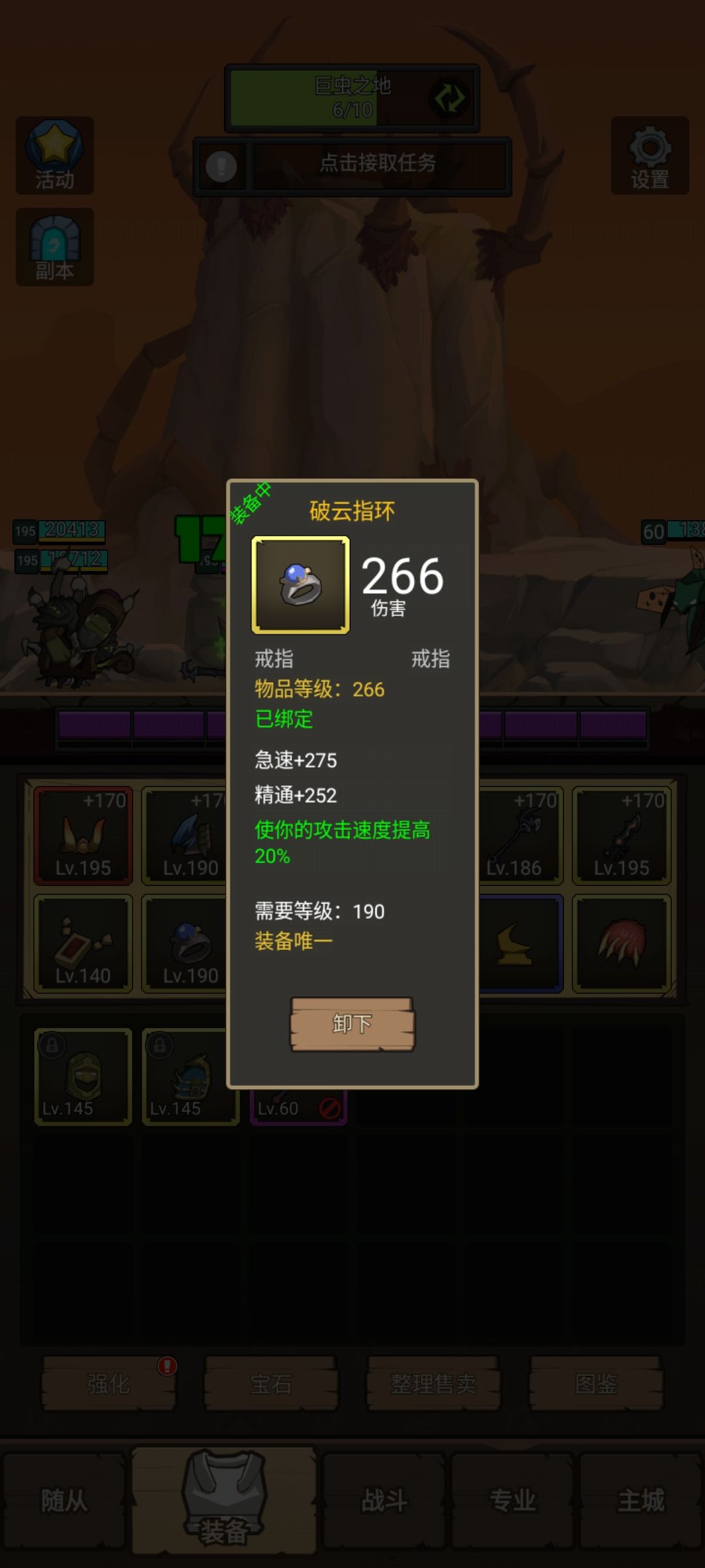 戒指:190级破云指环+190紫装伤害戒指,提供20%攻速。