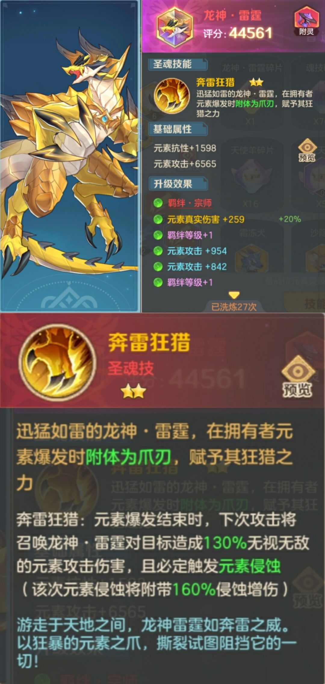 龙神雷霆升星,初步升到三星出效果,最高可以获得30%额外元素增伤和70%额外侵蚀增伤。保底要升级到五星出羁绊等级+1属性,这个就涉及到元素圣魂除了圣魂技以外的另外一层运用:提升元素主魂技羁绊等级。