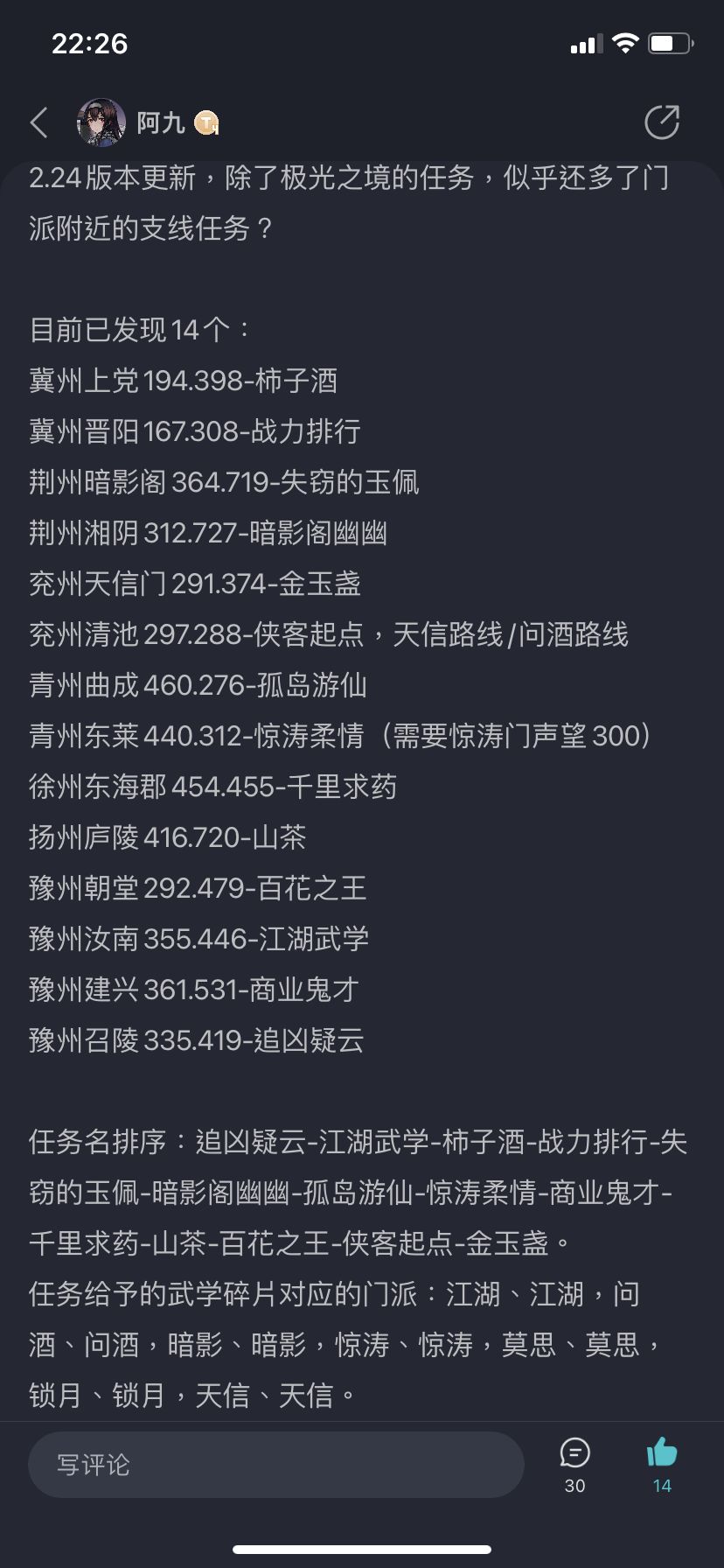 第四次更新(2023.3.29):荆棘之地系列4个任务+门派系列任务8+?个(注:门派系列可能未全,目前尚待挖掘)