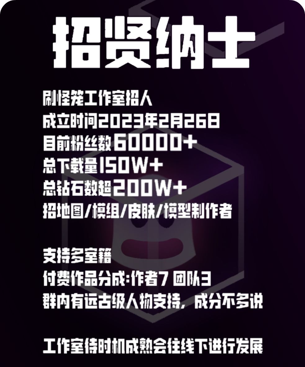 今年2月26日刚成立,目前在起步预热阶段,欢迎有想法的加入我们,工作室内有13年贴吧时期我的世界手机版吧著名工作室雨树山林工作室的社长,TDF(FAI)工作室社长,前FAI躲猫猫租赁服服主等,想知道更多可在贴吧搜“逗比小猪残影”查看。