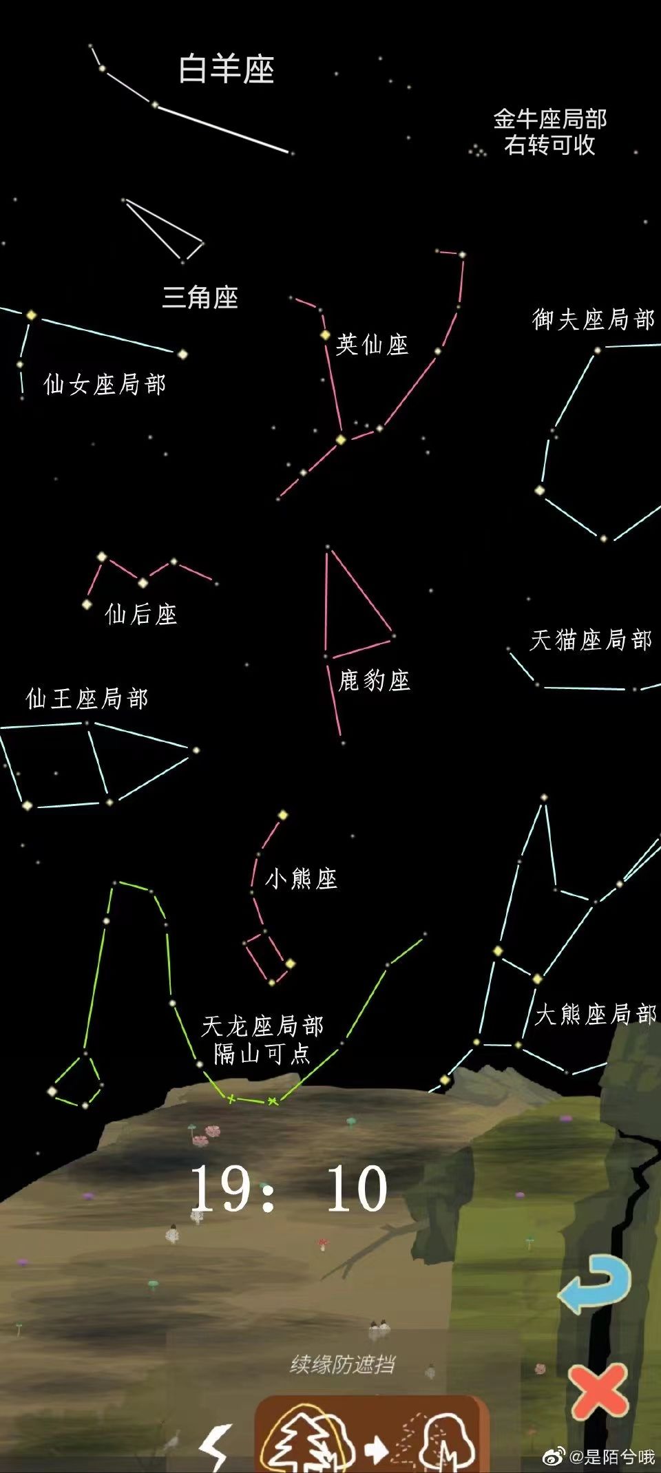 晚7早7旋转可收集星座:三角座、蝎虎座、仙王座、仙后座、仙女座、鹿豹座、小熊座、狐狸座、天琴座、天龙座、武仙座(因为旋转比较多的问题,图片显示不全,武仙座稍微旋转可以收集)