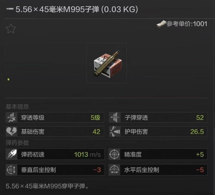 M995弹是为发射M855子弹的步枪和机枪专门研制的穿.甲.弹,在命名规则上与M855子弹相同,同样是制式装备序号。M995最初开发的目的是增强士兵对付轻型装甲车辆的能力。在1997年针对BRDM-2型装甲运输车的实验中,其穿透力在穿过车体一侧后仍能保持足够的杀伤力。因此它自然也是游戏中5.56x45毫米子弹家族中穿透能力最强的。