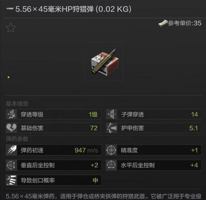 HP是空头弹又名空尖弹的英文缩写,全称是Hollow Point,顾名思义就是弹头尖端中空的子弹,属于扩张型弹头。这种子弹在击中目标时,子弹速度的动能会使弹头破裂、变形以及扩张,破裂的弹头碎片会随同弹头的旋转呈爆炸性裂开,对受击目标造成大量体内创口,形成有效杀伤。因此,游戏中HP狩猎弹拥有同口径子弹中最高的肉伤。当然,因为弹头尖端中空,这种子弹的贯穿能力有所不足,容易被防弹材料挡下,因此子弹穿透等级和护甲伤害都相对更低。