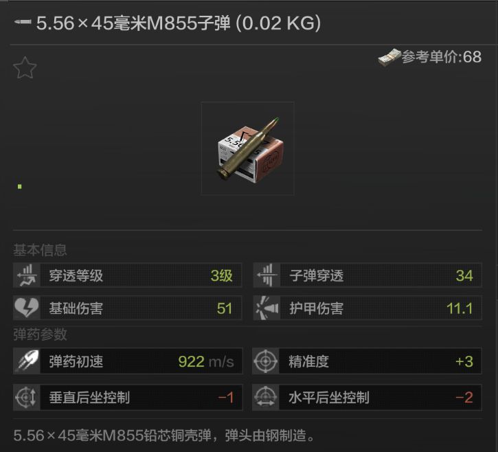 M855是一款军用制式弹,名字中的“M”代表Model,即“式”的意思,后面的“855”则是正式列装后获得的序列编号。由于弹头常被涂为绿色,俗称“绿头弹”,仔细观察游戏内插图我们也能看到子弹尖部有明显的绿色涂装。其前身铅芯的M193步枪弹被诟病最多的就是远距离杀伤力与穿透力不足。M855为了满足较远距离的穿透性,将弹头前半部分换成了钢芯。作为标准弹药,M855能对人员和轻质防弹材料造成有效杀伤,但在穿透汽车门板等物品后弹头容易过早破裂成小碎片进而失去杀伤目标的能力。