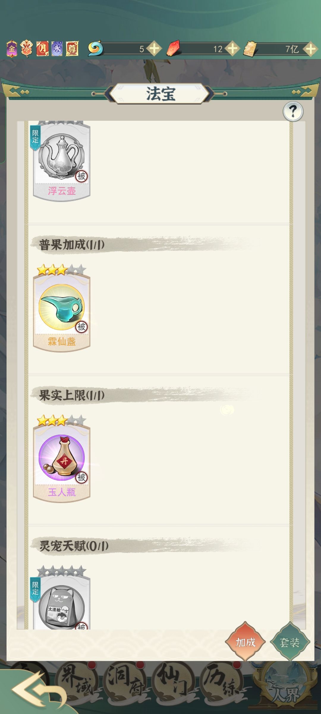 3:关于嗑果子建议:首先,嗑果子的前提是得有霖仙盏跟玉人瓶这俩法宝的支撑。如果法宝等级不高,直接无脑炼丹冲境界。嗑果子的意义只存在于斗法第一,打同境界。只要你法宝星级高,还能跨境界打人。不过代价就是炼修速度会慢。从由来的第一二档修炼等级掉到第三档。换来的就是斗法第一,拿多多荣耀,多多法宝。最后一定要知道,霖仙盏,玉人瓶等级不高的情况下,请匆嗑果子!!!!请嗑丹药!!!嗑果子的属性,全靠这俩法宝来提!!!