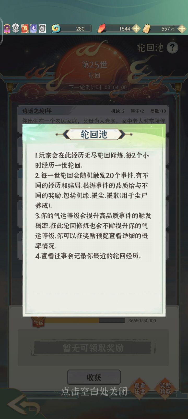 气运等级会提升高品质事件的触发概率,在此轮回修炼也会不断提升你的气运等级,你可以在奖励预览查看详细的概率情况。
