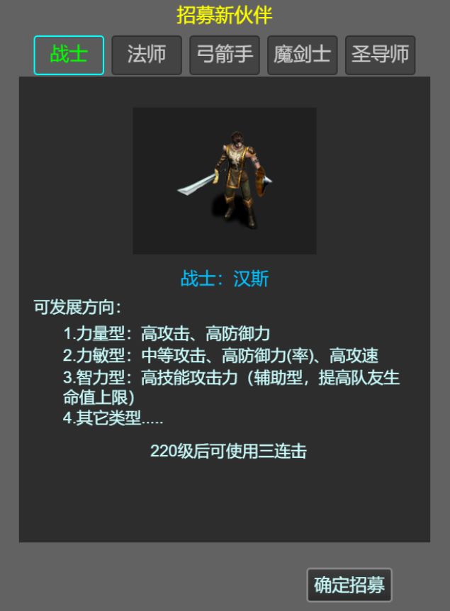 该游戏有5个职业(战士、法师、弓箭手、魔剑士、圣导师),每个玩家总共可招募5个伙伴,同一种职业最多可重复招募两名,所以,职业的组合搭配,可以有很多种。
