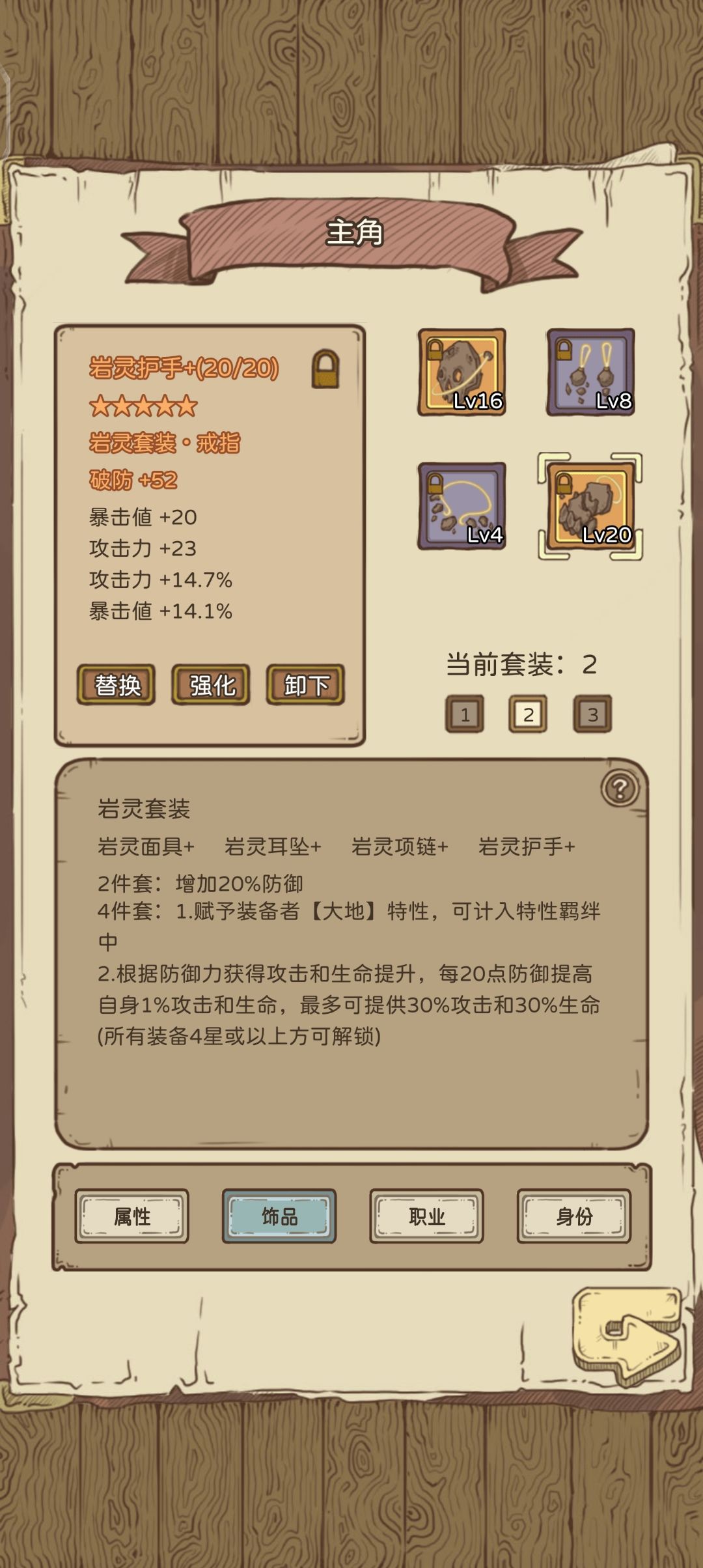 装备强化,过不去图就去强化一下装备,紫色就可以强化一下了,分解会返还一些精华可以用来过渡,前期叠攻击,后面换生命和一些攻击看职业,战士最好就是生命防御,这件升到20基本是全攻属性的,打人很舒服,4件套有羁绊属性,需要紫色装备
