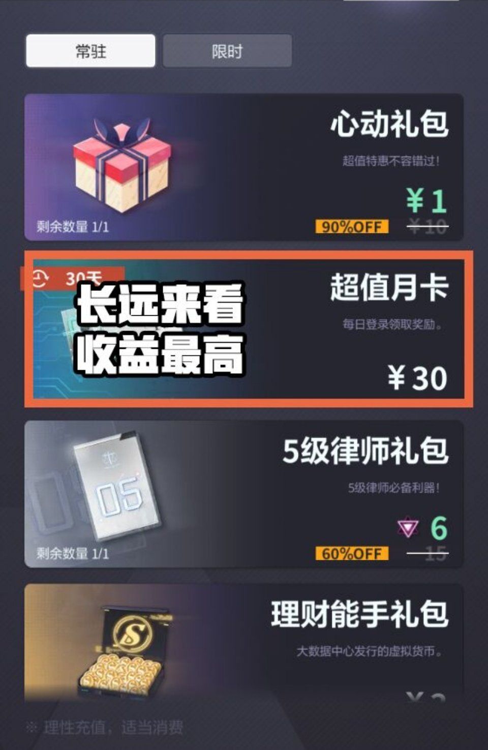 2、只可单次购买的常驻礼包(心动、特惠、超值、豪华、奢华),性价比很高,但不一定要马上购买。