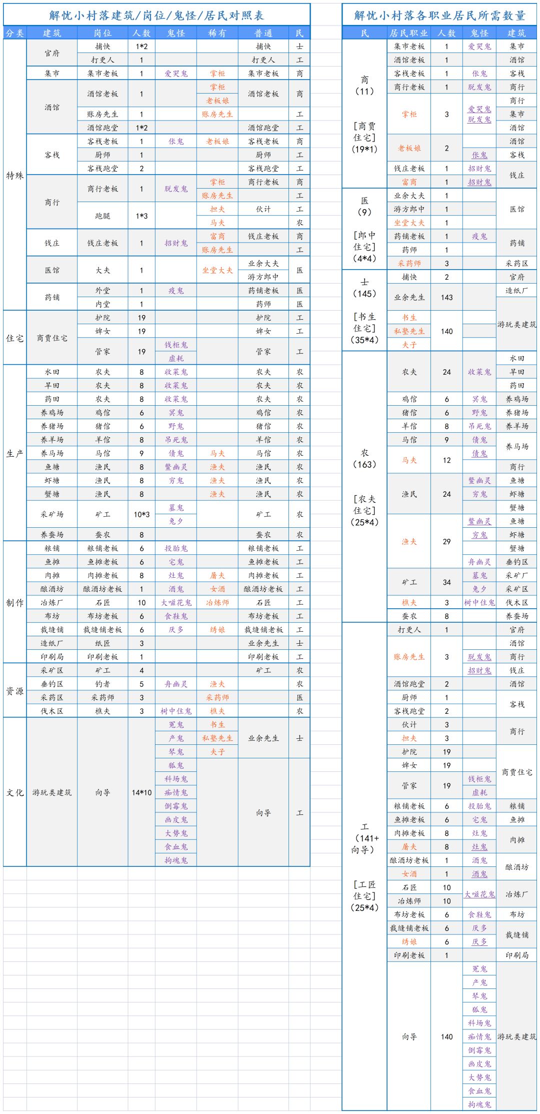 居民和建筑详细的对照表可参考我的另一篇攻略,链接放在下边。下面放一张两表的合集。
