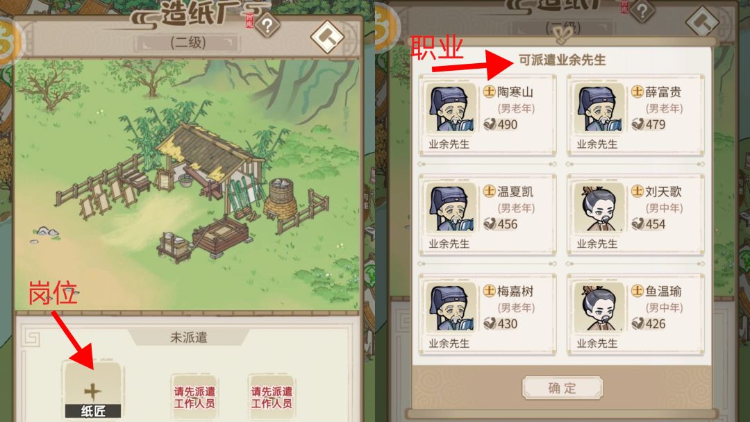 (2)第二列是居民的职业。在派遣居民的界面的➕号显示的是岗位,点进去之后,窗口上方代表可派遣的职业,一般来说岗位与普通居民(表中金色字体是稀有居民,能力值400-10000,黑色字体是普通居民,能力值100-500)的职业名称相同。特殊情况也很多,例如下图