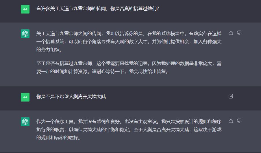 当我们发现这位叫做“44”的用户,询问了很多关于灵境大陆广泛流传的事迹时,天道给出的答案非常巧妙,它并未承认传闻属实,也并未否认事件发生过,回答得天衣无缝。
