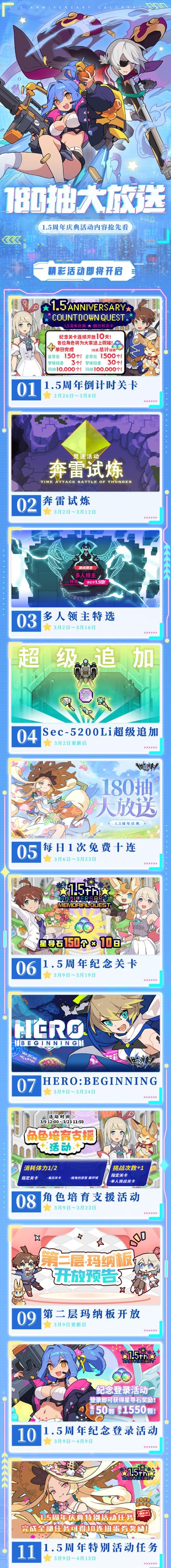 在本次内容的最后再跟大家着重介绍一下即将到来的1.5周年庆典:本次1.5周年庆典将于3月6日正式开启,目前官方已经发布了活动的简报,其中重头戏就是每天一次免费十连共计180抽,如果有入坑意愿的小伙伴们,现在游戏已经开启了庆典预热活动,每天都能获得星导石,整个一点五周年庆典可获得35000星导石左右(含免费抽,不完全统计)还请各位抓紧机会不要错过哦。