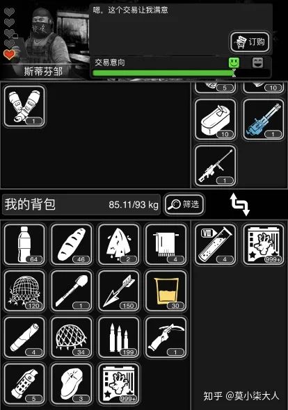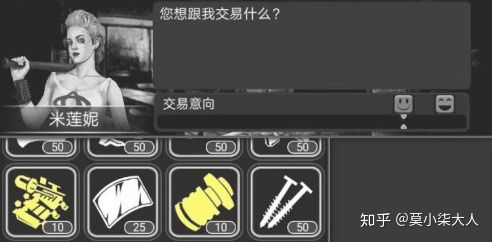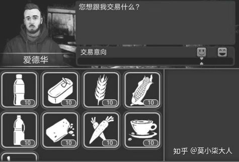 食品商人爱德华:喜爱贵重物品(金条、钻戒、现金等),如果食物不是极度短缺建议不要与他进行交易,因为比较黑。