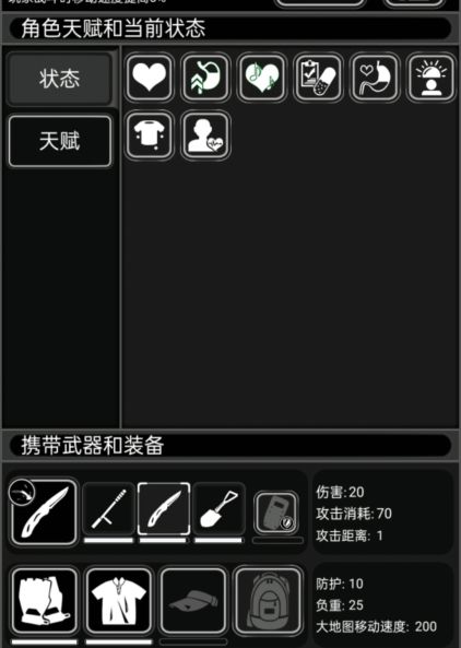 5.要不时注意下当前角色的状态,可能吃个泡面会引起【腹泻】,这种不治疗会一直掉血的。最下面的武器点击左侧的图标来安装武器,除了手套和衣服外还可以戴个帽子和背包,背包可以在工具台制作。