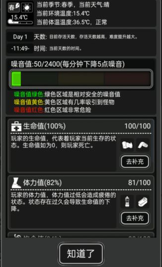 6.游戏要注意的属性比较多,要照顾好自己的体温、注意心情、体力、健康、饱食度、水分、清洁度等等,所以代入自己是在真实的世界,遇到奇怪的东西不要吃,就会好很多。