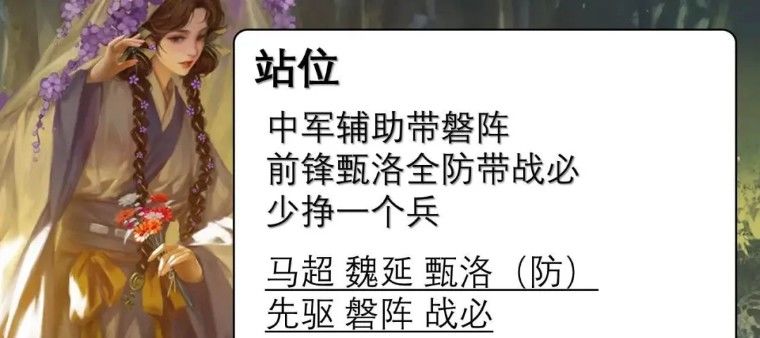 大多数情况都是甄洛带红,魏延陆抗白板,所以通常我还是会选择陆抗魏延带磐阵站中军,前锋甄洛全防带战必,少挣一个兵的站位策略