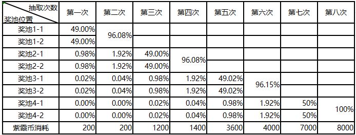 *【概率说明】:此表为默认每次抽到最高概率道具时的概率,如若第一次抽到奖池2-1道具,因抽奖获得道具将不再重复获得,则第二次实际抽奖概率与图中描述第二次概率不同,抽到高奖池道具概率会相应提高。