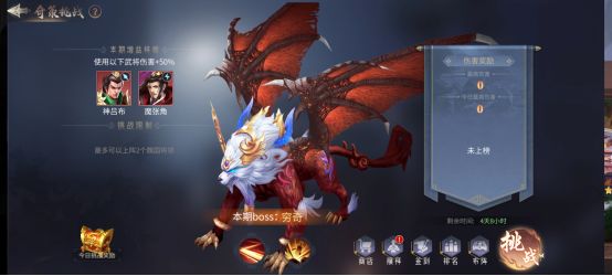 奇策挑战模式的玩法核心是挑战boss,通过对boss的伤害量进行奖励的发放以及排名,每一期的奇策挑战有两个增益武将,增益武将在打boss时能获得50%的伤害加成。