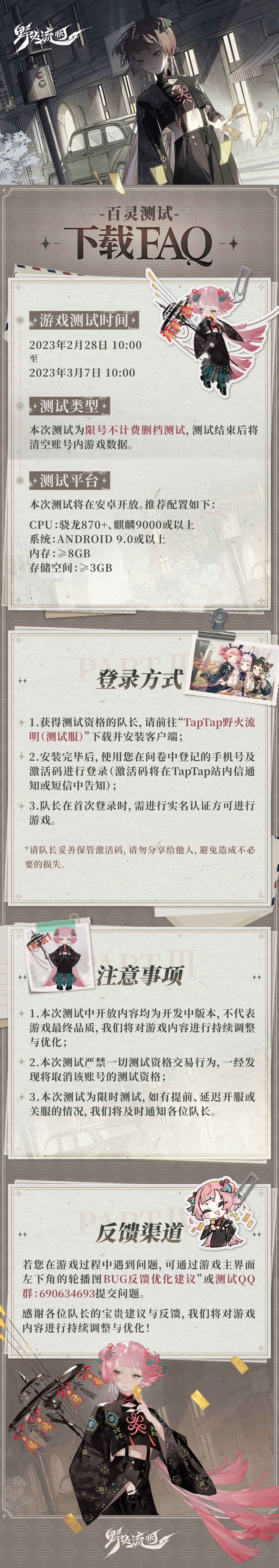 请获得测试资格的队长,前往TapTap“野火流明(测试服)”下载并安装客户端,并及时加入百灵测试交流群:690634693。