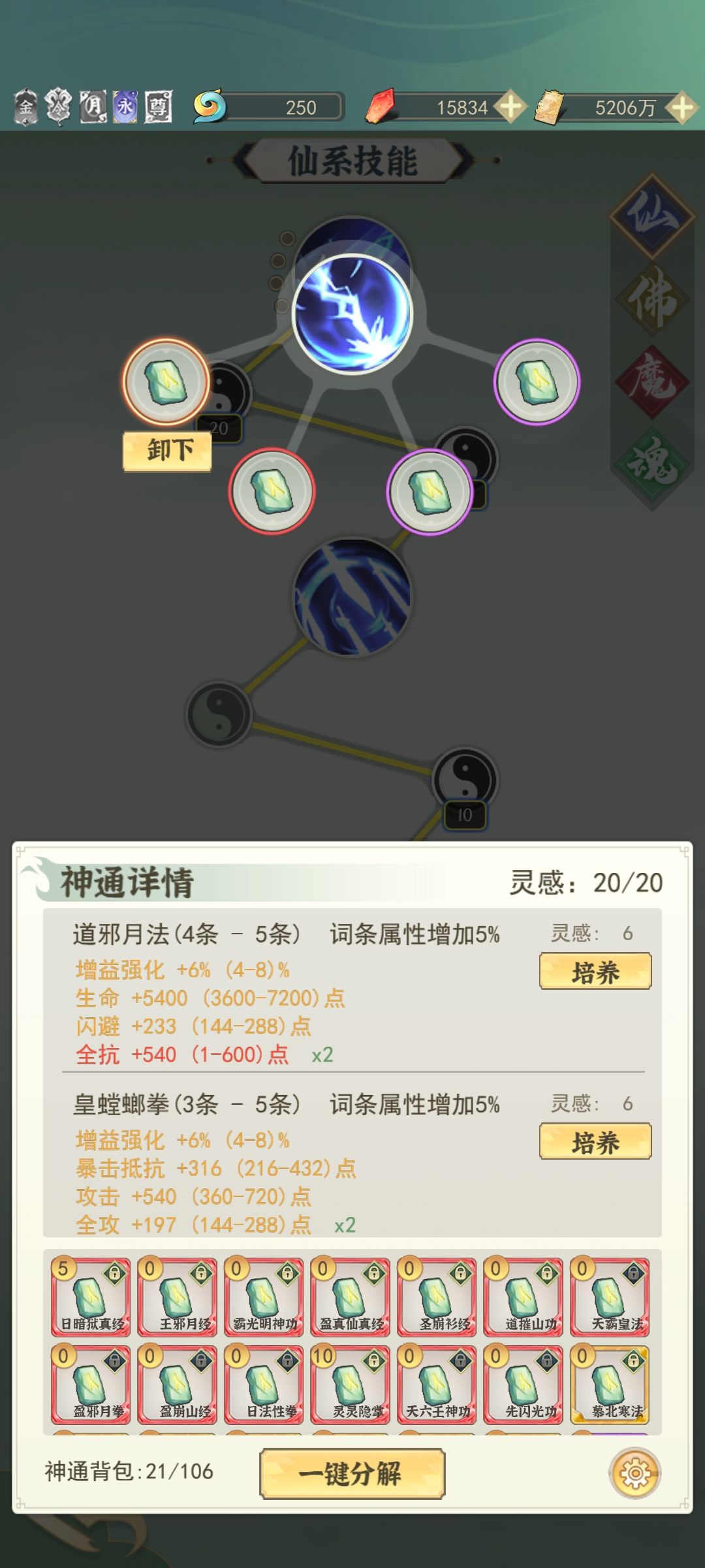 然后就是开放悟道系统,悟道开启后人界礼包有灵石买的4种灵感,算是白送。栏位可选用仙玉开启(迟早都要开),选配方4或12进行悟道,只要有增益强化词条的神通,每强化五级会随机一个词条加一倍,最好的都是增益强化加到底(说白了看运气),但是前期在你出战的技能4个里面塞满16个神通就行了(注意每个品质神通在每个技能占用的灵感是不一样的,一般是2红2紫或极品4橙),只要在出战技能上镶嵌就能加成在人物身上。橙色一般不升除非是真的好,神通词条数越少,且带增益越值得升(概率上不容易歪),若感兴趣深入了解可以移步其他神通教程。(神通弄的好,千氪打万氪)