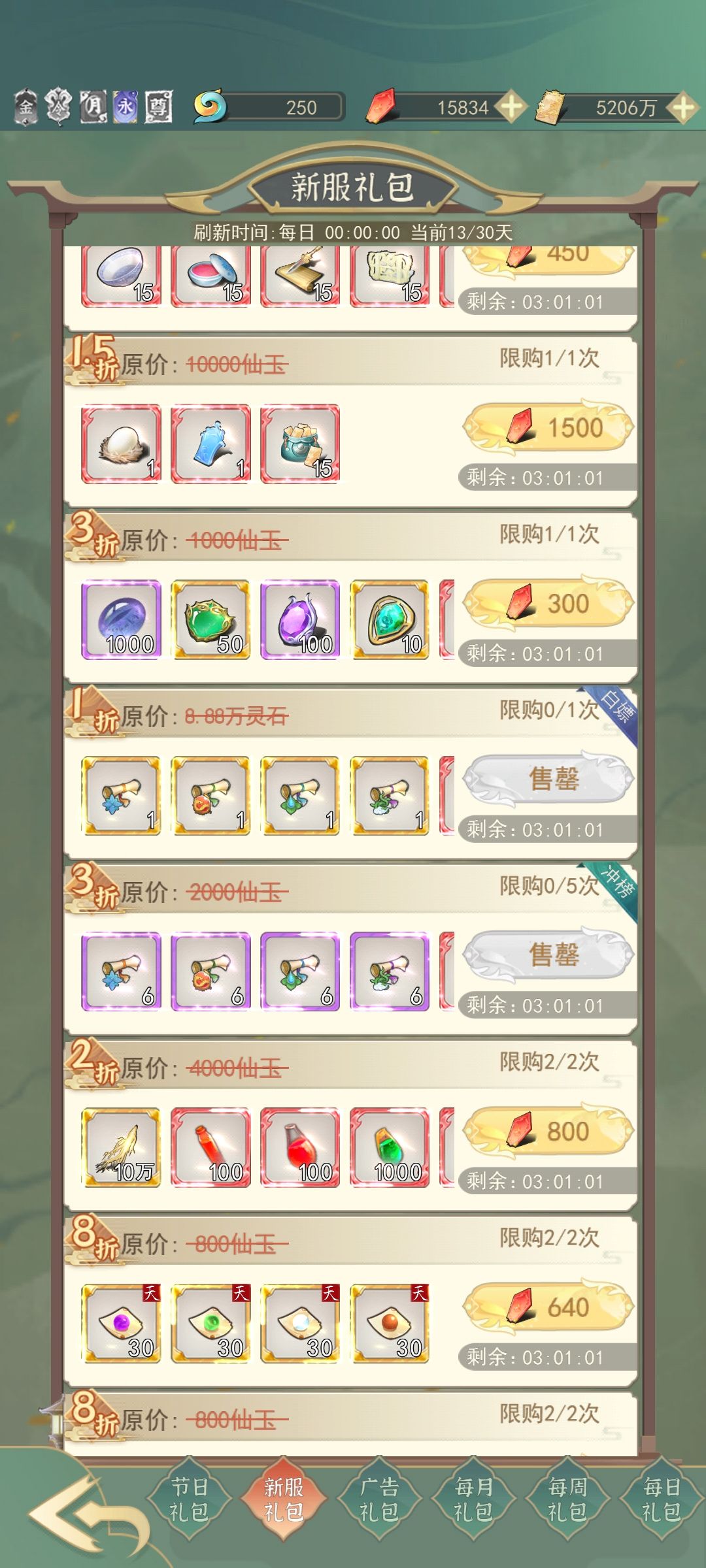 后续人界开启,红点全部点点点,新服礼包(人界那只狮子)买8888灵石的钥匙和紧挨下面的600仙玉钥匙5次买满(每日12点刷新,仙玉还够就一直买),节日礼包全部用灵石买的都买满。