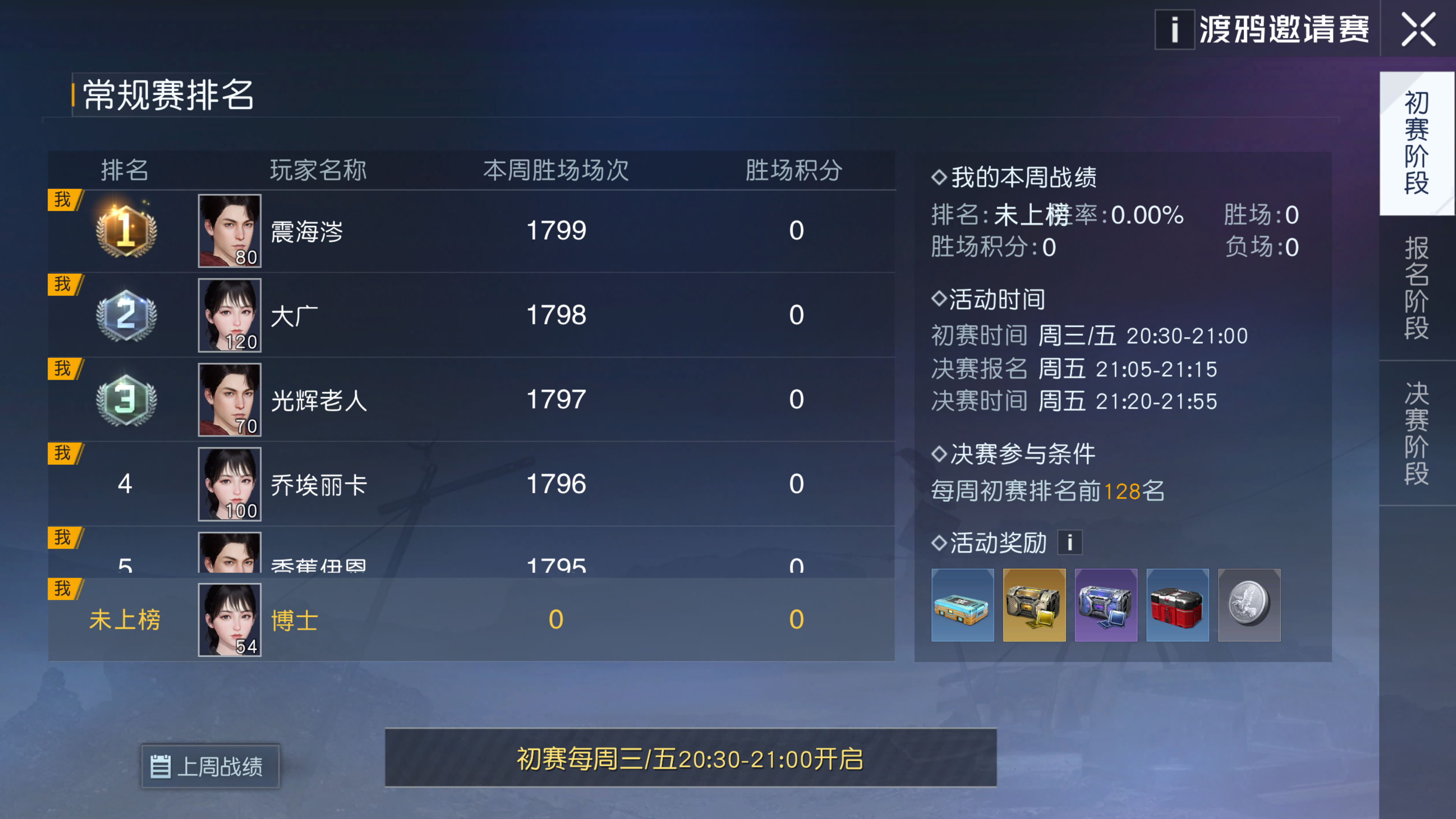 首先,我们先了解一下渡鸦邀请赛。渡鸦邀请赛分两个阶段进行,第一阶段是初赛,第二个阶段是决赛。参加渡鸦邀请赛没有营地和阵容的限制,所有玩家均可单人报名匹配,或者是自由组成四人小队报名匹配。需要注意的是,只有在初赛中排名达到前64位的幸存者才可以参加决赛。