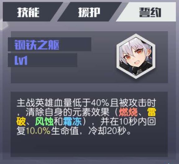 曼施坦因的誓约技能在觉醒之后,主战英雄的血量低于一定百分比时,被攻击会清除自身的元素效果,并在短时间内回复一定生命值,且同时免疫元素效果。
