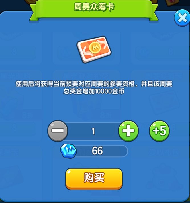 本周,我们针对没空完成周预赛的玩家们推出了“周赛众筹卡”!只要花费66钻石购买众筹卡,即可获得当前预赛对应周赛的参赛资格,并且会将该周赛的总奖金增加10000金币!也就意味着,除了拿到周赛的参赛名额以外,还可以为所有玩家谋福利,提高奖金总量哦!
