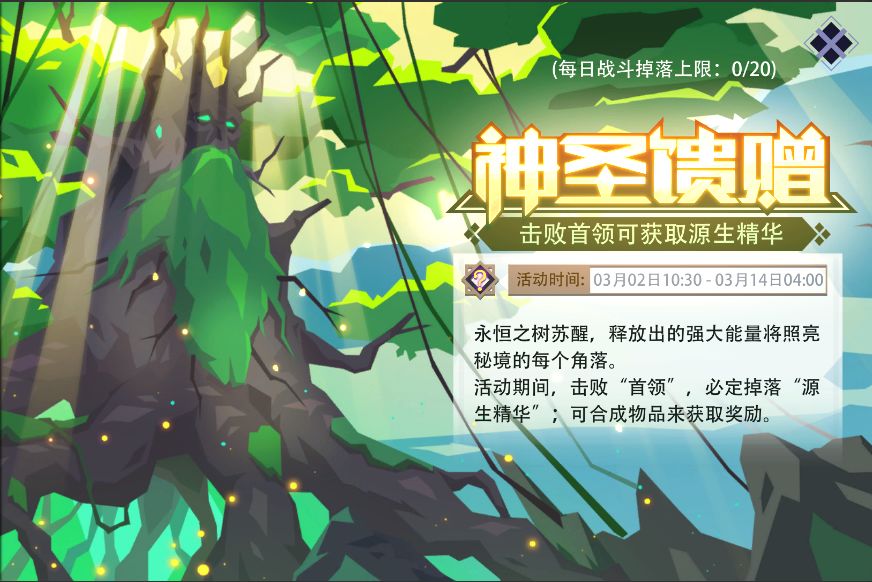活动内容:活动期间,在(冒险模式/冒险试炼场/梦魇模式)下击败任意“首领”,均可获得随机数量的“源生精华”;每日上限为20个。“源生精华”可用于合成[星辰之耀]。[星辰之耀]打开后能获得魂石、魔晶、灵魂碎片等奖励。