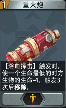 ※重火炮:特殊装备卡,【浴血挥击】触发时,使一个生命最低的对方生物的生命-4。触发3次后移除。