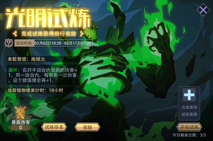 活动内容: 活动期间,每日可以挑战3次活动首领,获得关卡奖励。此外,每日进入伤害排行榜,还能获得额外奖励。