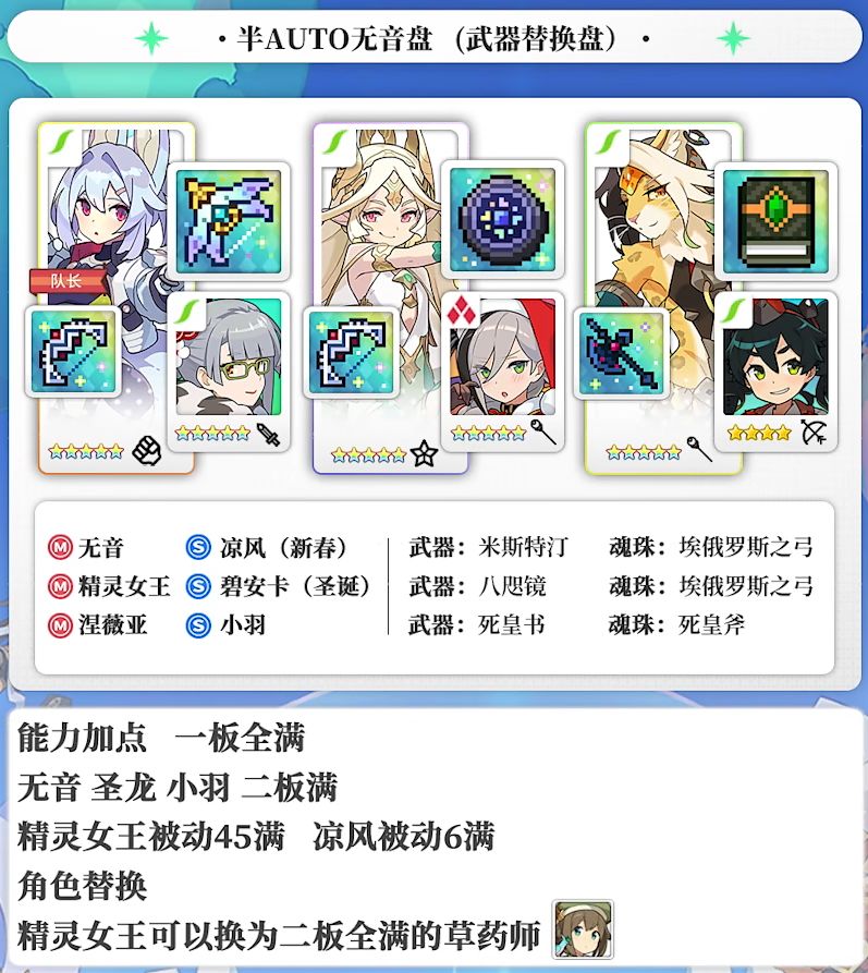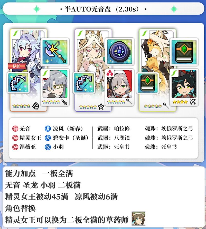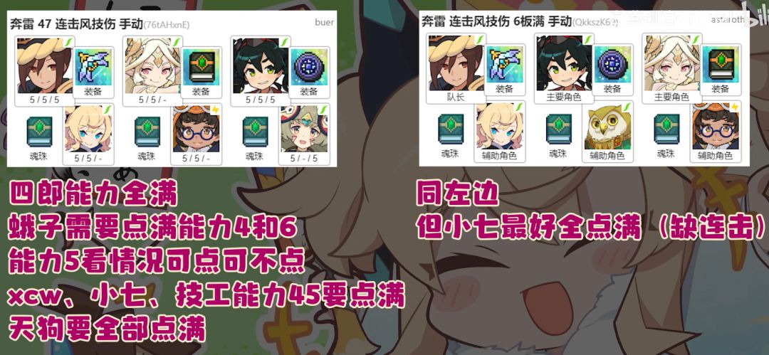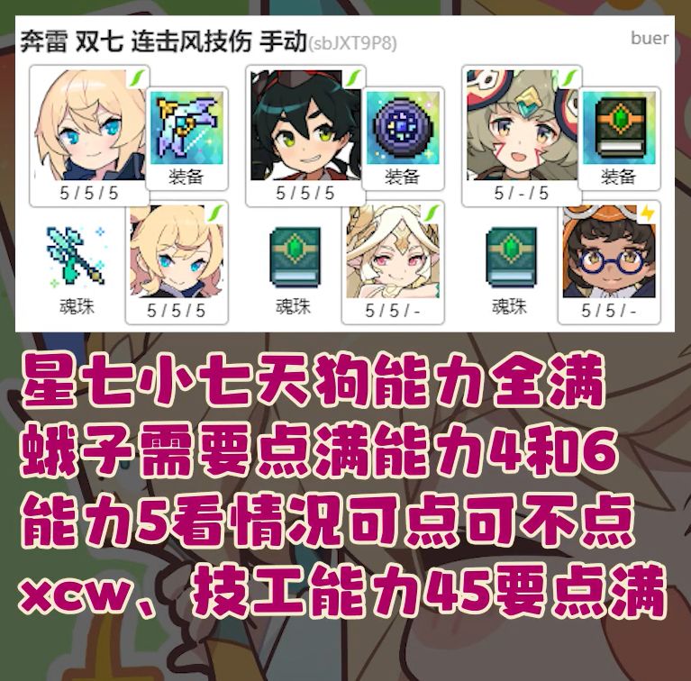 作为顶配的队伍构筑,本次竞速对五星的小七和xcw(精灵女王),四星的小天狗和三星的夏丝丝有着较难替换的高需求,同时本次由于使用了小七作为主c,所以攻略中还需要考虑连击数的限制