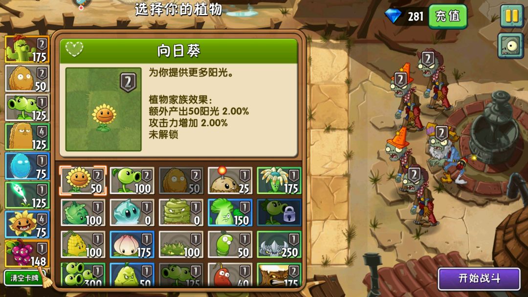 游戏的开始:前期先种向日葵,获得阳光,因为有阳光限制,向日葵种植2颗也就够用了。前期一定要注意对花坛的保护,所以可以先做坚果墙,因为坚果CD较长,所以坚果CD一好立马上场,挡在被保护植物面前,同时可以种植一排输出植物仙人掌,阵容如上图。双向投手种植2颗,种植在移动铁轨上,主要针对淘金僵尸,因为淘金僵尸数量不多,2颗也就够用了,按照这个思路过关简简单单 ,并且还有对于阳光。