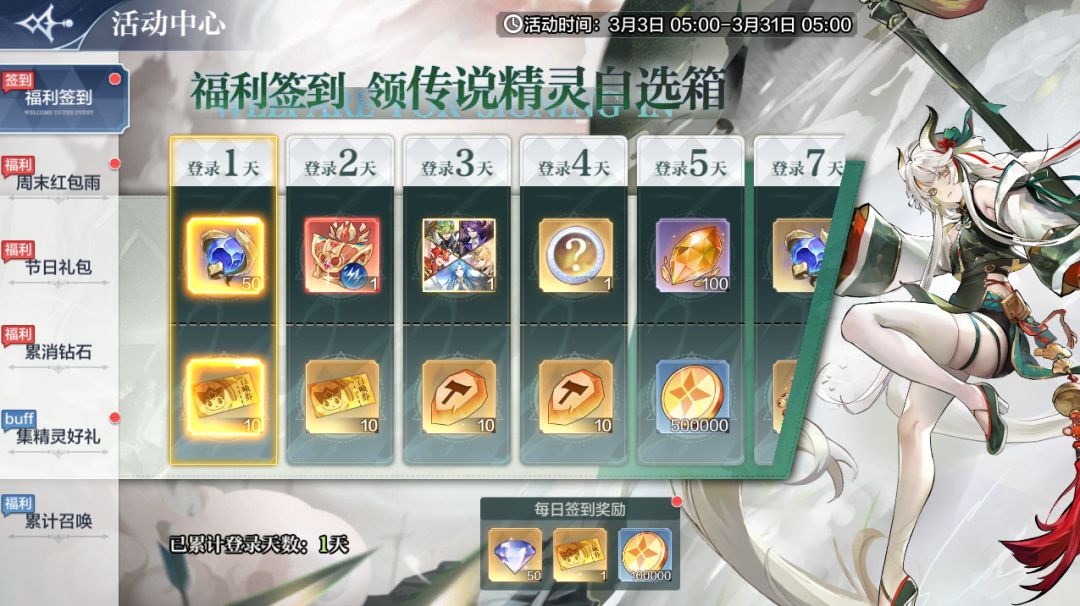 活动内容:新一期累签活动开启!每日签到可领钻石*50、召唤券*1、金币*10万,更有额外累积签到奖励等你解锁!别忘了每日登录噢~