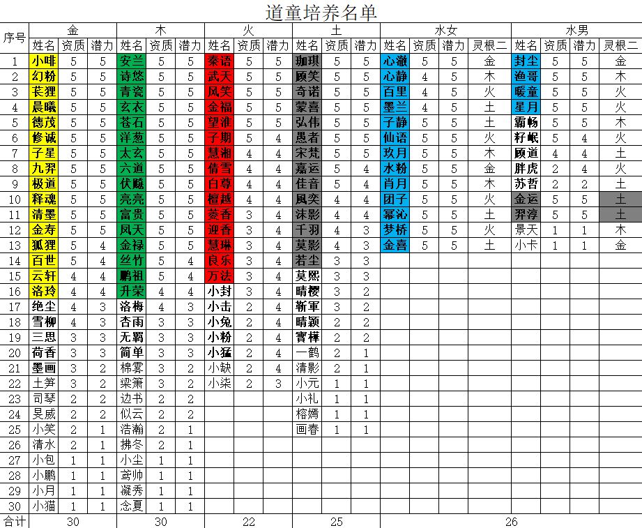 图中标颜色的是不包含生命阵法所需的全部道童,加粗的是生命阵法所需道童,没有任何标记的道童暂时无需培养,其中水系道童选择同性资质最差的两个不用培养,水系第二属性是土属性的两个满资质同性道童按土属性培养。
