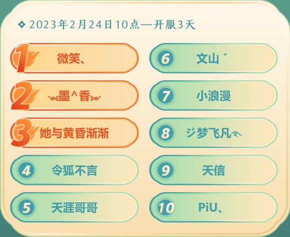 开服后短短5小时内,经过一番激烈角逐之后,诞生了榜单前十名,名扬江湖从此刻起!
